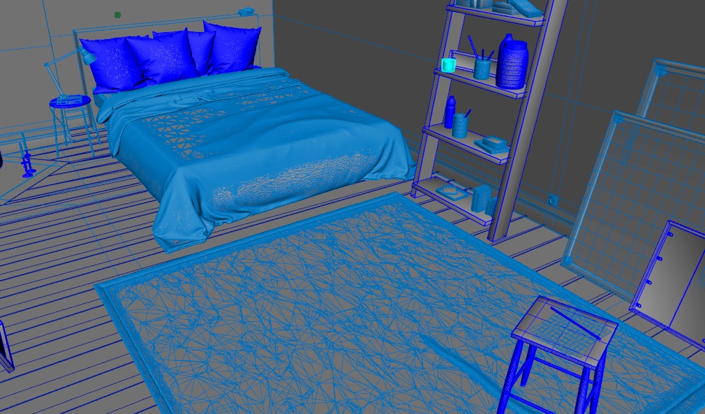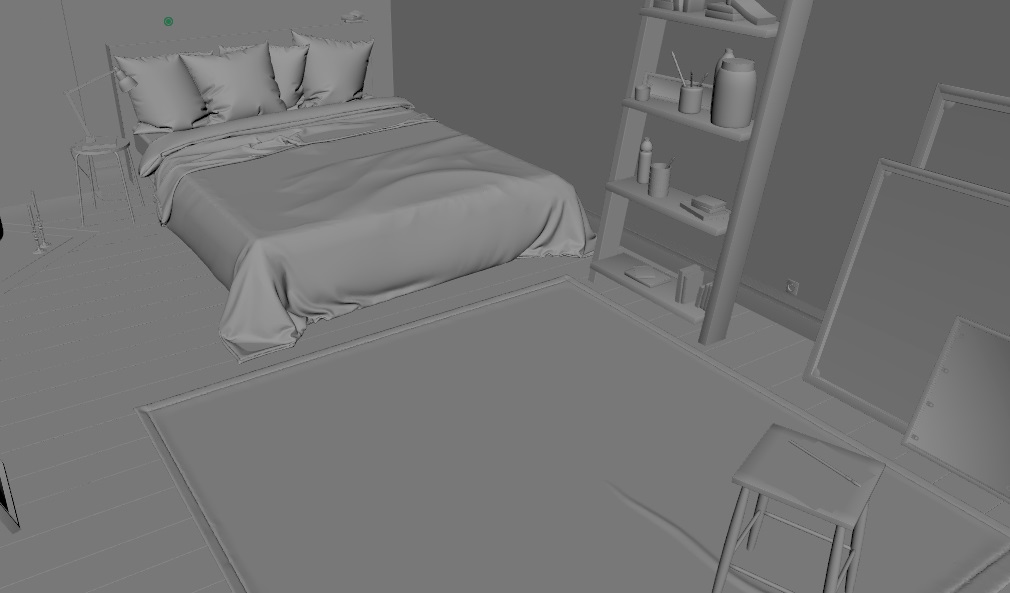 Pour le shading, la partie la plus longue fut de déplier tous les UVs. Les shaders quant à eux, reste très basique. En voici la preuve avec deux shaders différents (Couverture de lit et Boitier Blue-Ray) :