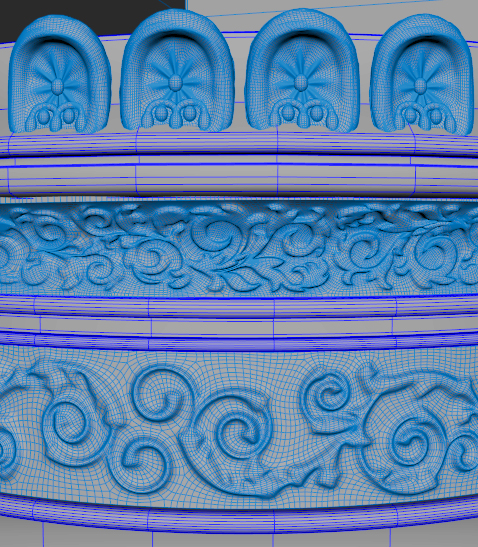 Seuls les ornements présents à plusieurs endroits dans la scène ont été réalisés sur zBrush. L’outil ZRemesher fut grandement utile pour obtenir un maillage propre sans réellement y passer du temps.