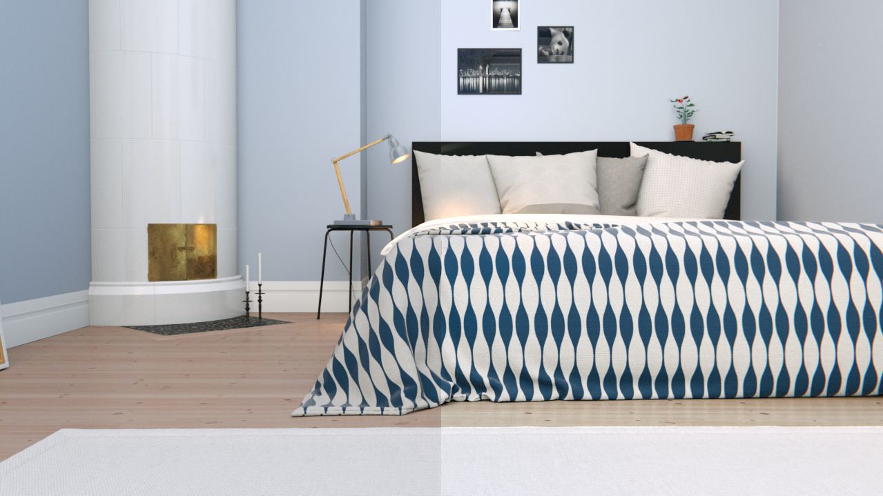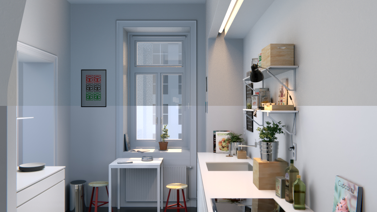 Pour le lighting, cela se résume à une HDR, trois « Octane IES Light » au niveau des lampes allumées dans la scène 3D (Une dans chaque pièce) et des « Portal Lights » à chaque fenêtre. A cela s’ajoute quelques « Octane Lights » situées dans le bâtiment extérieur qui fait face à l’appartement.