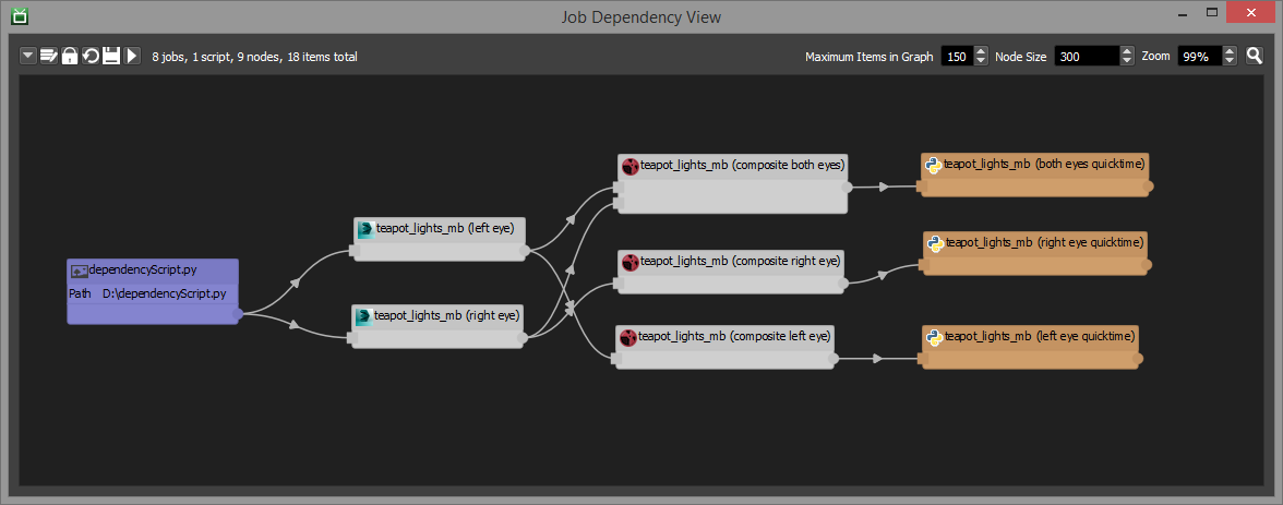 Un petit exemple de scenario (vécu) possible avec Deadline pour une image et deux séquences animés (18 nodes) :